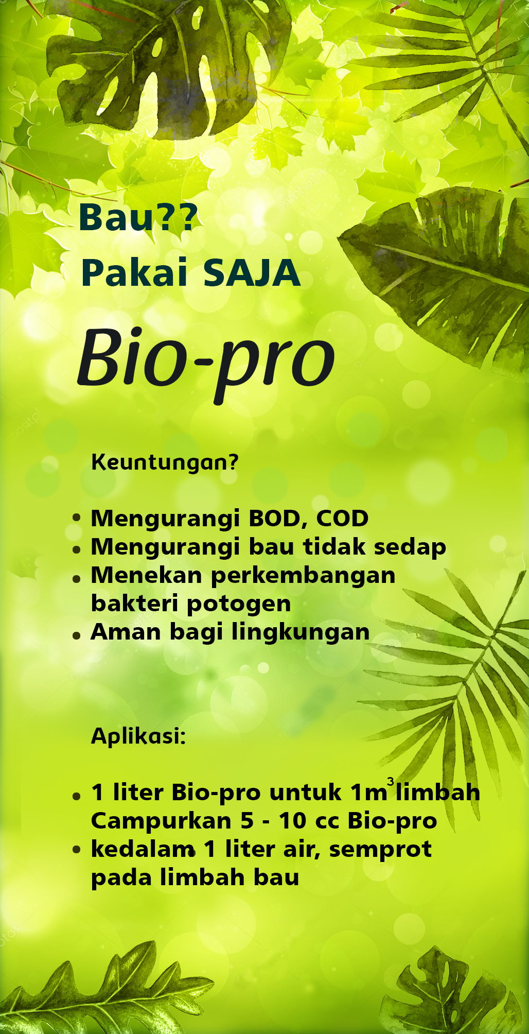 - Campurkan 5 – 10 cc Bio-Pro ke dalam 1 Liter Air, Semprot pada limbah bau.