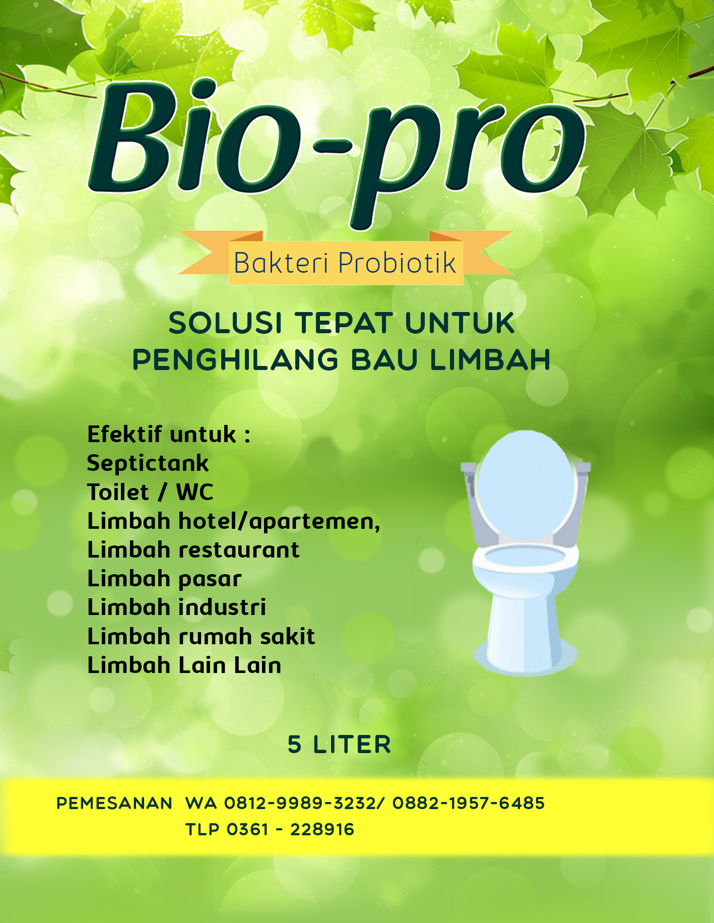 BIOPRO telah diuji klinis di laboratorium, mengandung miliaran bakteri probiotik (bakteri baik) yang berfungsi untuk mengurai limbah.